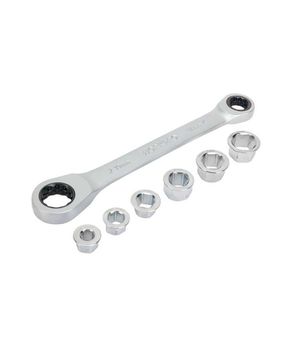 Llave mixta de carraca articulada Workpro, fabricada en acero cromo-vanadio cromado mate. Disponible en medidas de 10, 13, 17 y 19 mm.