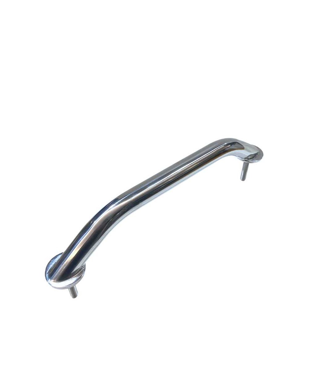 Maneta o pasamanos de acero inoxidable AISI 316 con tubo redondo de 22 mm y acabado pulido brillante. Montada con dos pernos de Ø8 mm. Longitud total 300 mm (entre pernos 275 mm).
