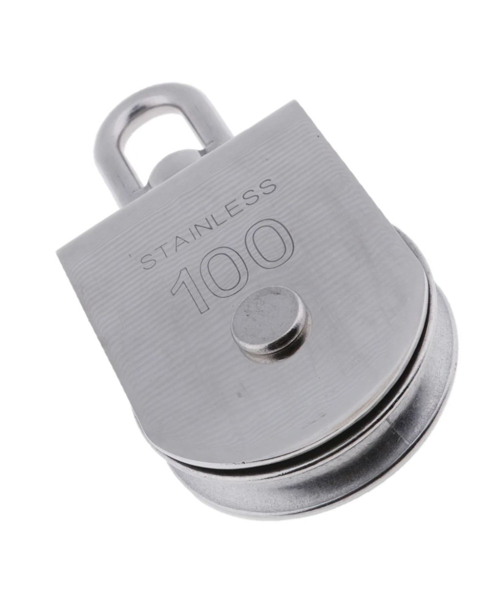 Polea giratoria simple en acero inoxidable AISI 304, con grillete giratorio integrado y construcción robusta. Disponible en Ø 25, 32 y 50 mm.