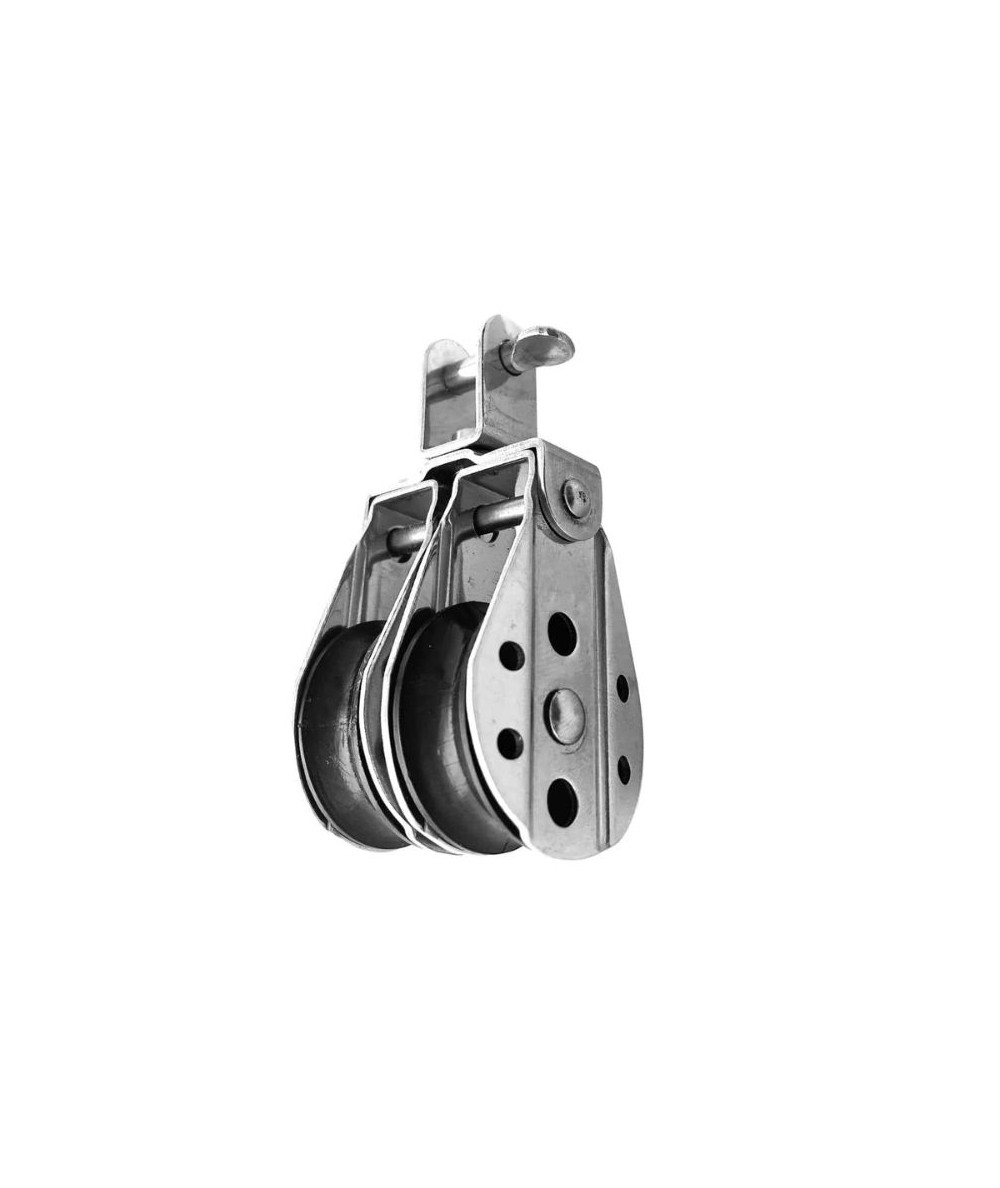 Polea mini doble giratoria fabricada en acero inoxidable AISI 316 y roldanas de Delrin. Su diseño evita los roces laterales, garantizando un movimiento fluido del cabo y mayor durabilidad en entornos marinos.