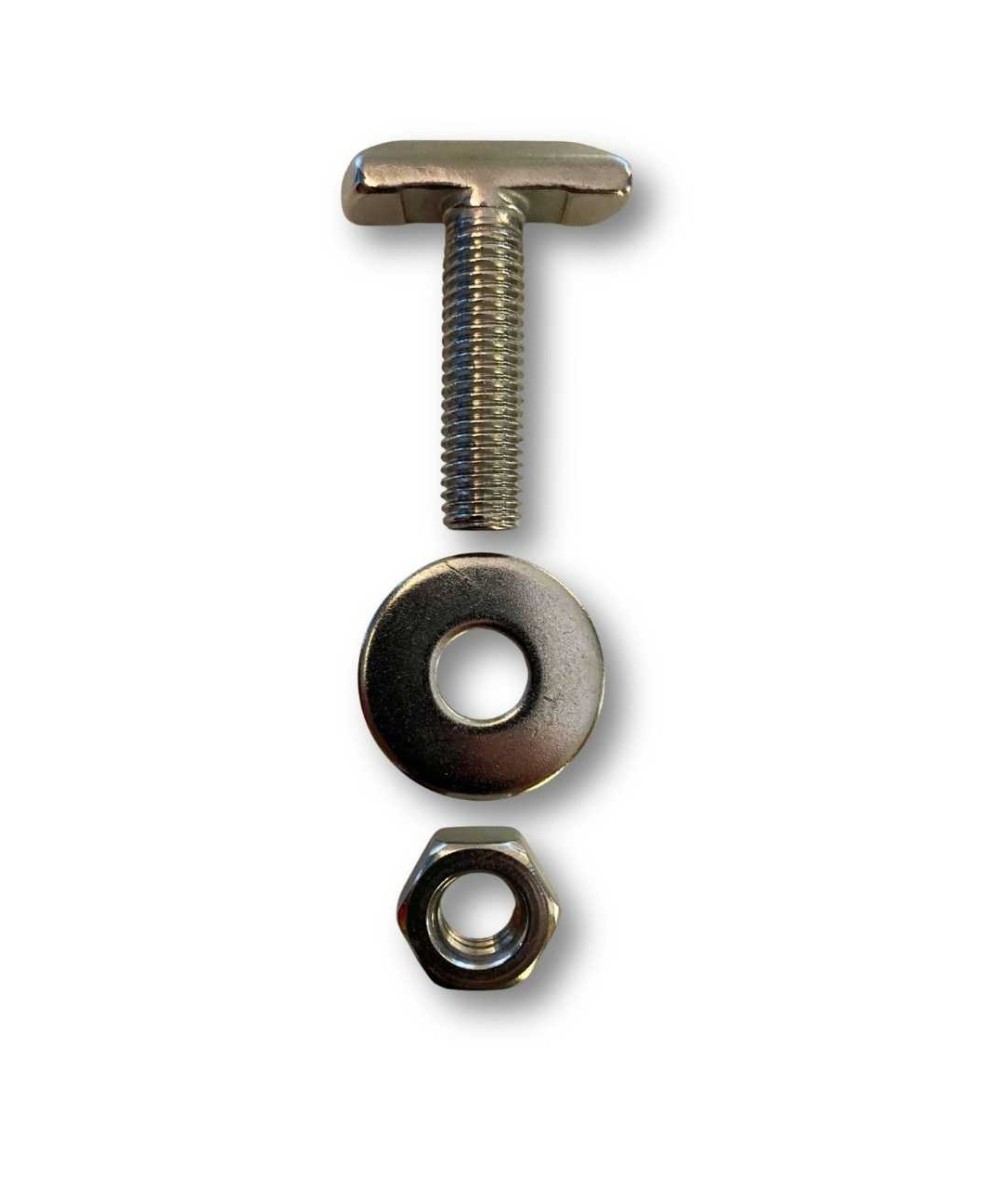 Juego completo compuesto por tornillo especial, arandela y tuerca en acero inoxidable AISI 316, con métrica M10. Diseñado específicamente para la instalación segura de las defensas de pantalán modelo 1-L de CASTRO u otras que requieran fijación robusta.