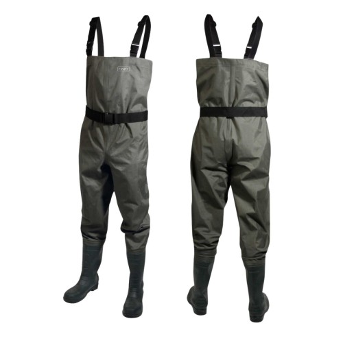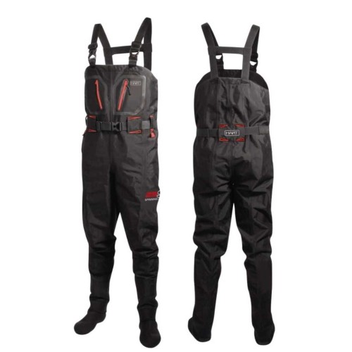 Vadeador fabricado en neopreno de 4,5 mm de espesor con bota de PVC y suela de goma integrada. Dispone de tirantes de neopreno regulables y rodilleras preconformadas. Incorpora bolsillo exterior de pecho con cierre de velcro, bolsillo interior de nylon y anillas frontales para colgar accesorios. Incluye cinturón de nylon, kit de reparación de emergencia y bolsa de transporte.