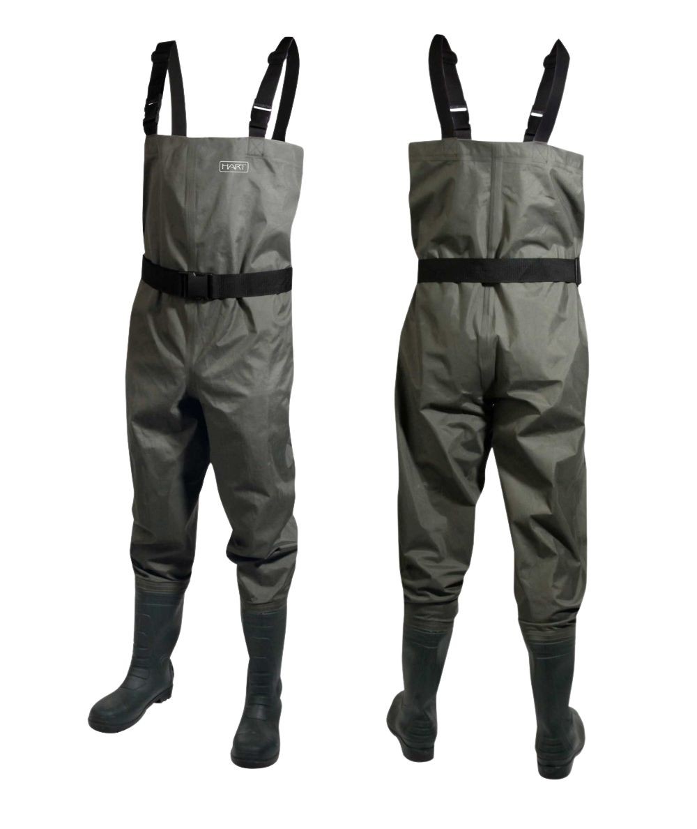 Vadeador de Hart en nylon/PVC laminado con costuras termosoldadas, tirantes regulables y botas integradas con suela de tacos. Incluye cinturón ajustable y bolsillo interior extraíble con cremallera (no estanco).