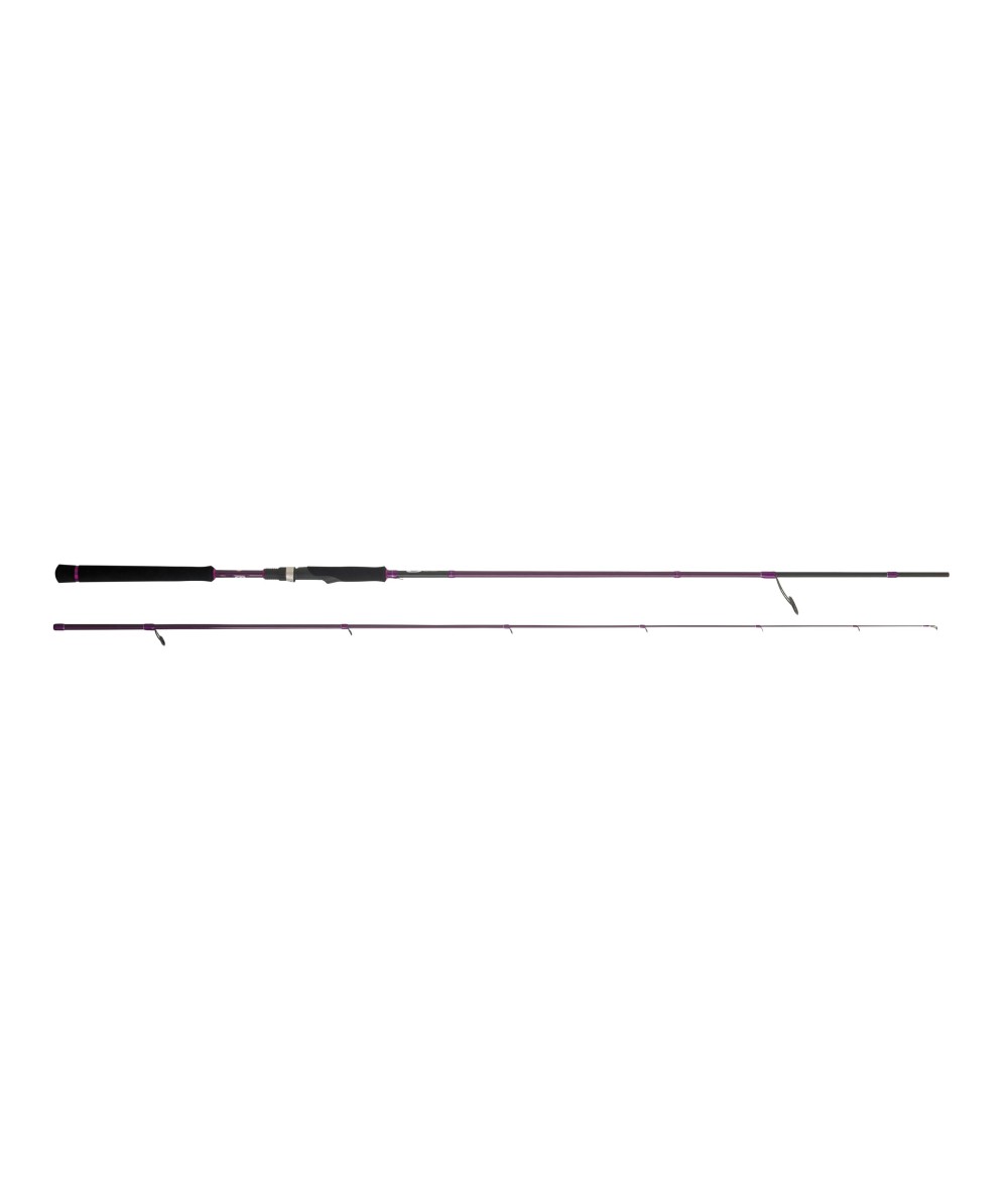 La Caña Cinnetic EXPLORER BLACK PURPLE Light Game 300M es una caña de spinning de acción media, fabricada en carbono 24T y equipada con anillas Fuji MNAD Alconite y portacarretes Fuji DPS.