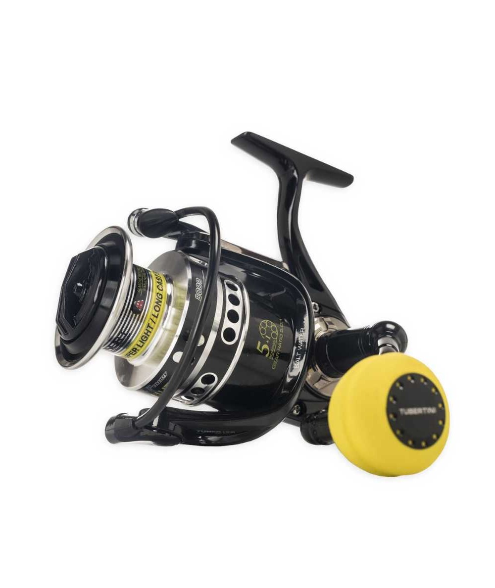 El carrete RYOBI TYRAN 5500 es un carrete de pesca de alta resistencia con freno de 22 kg, 9+1 rodamientos y un diseño robusto en aluminio de alta calidad. Ideal para pesca en el mar y combates con grandes depredadores.