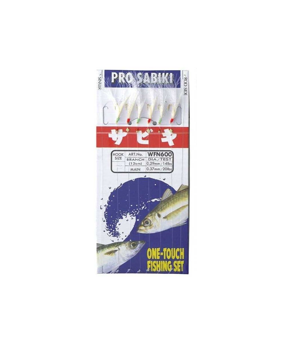 Metralleta Sabiki Asari Aji Maruseigo con 6 anzuelos japoneses nº4, plumas y línea de fluorocarbono. Ensamblado artesanal de alta calidad y gran efectividad.