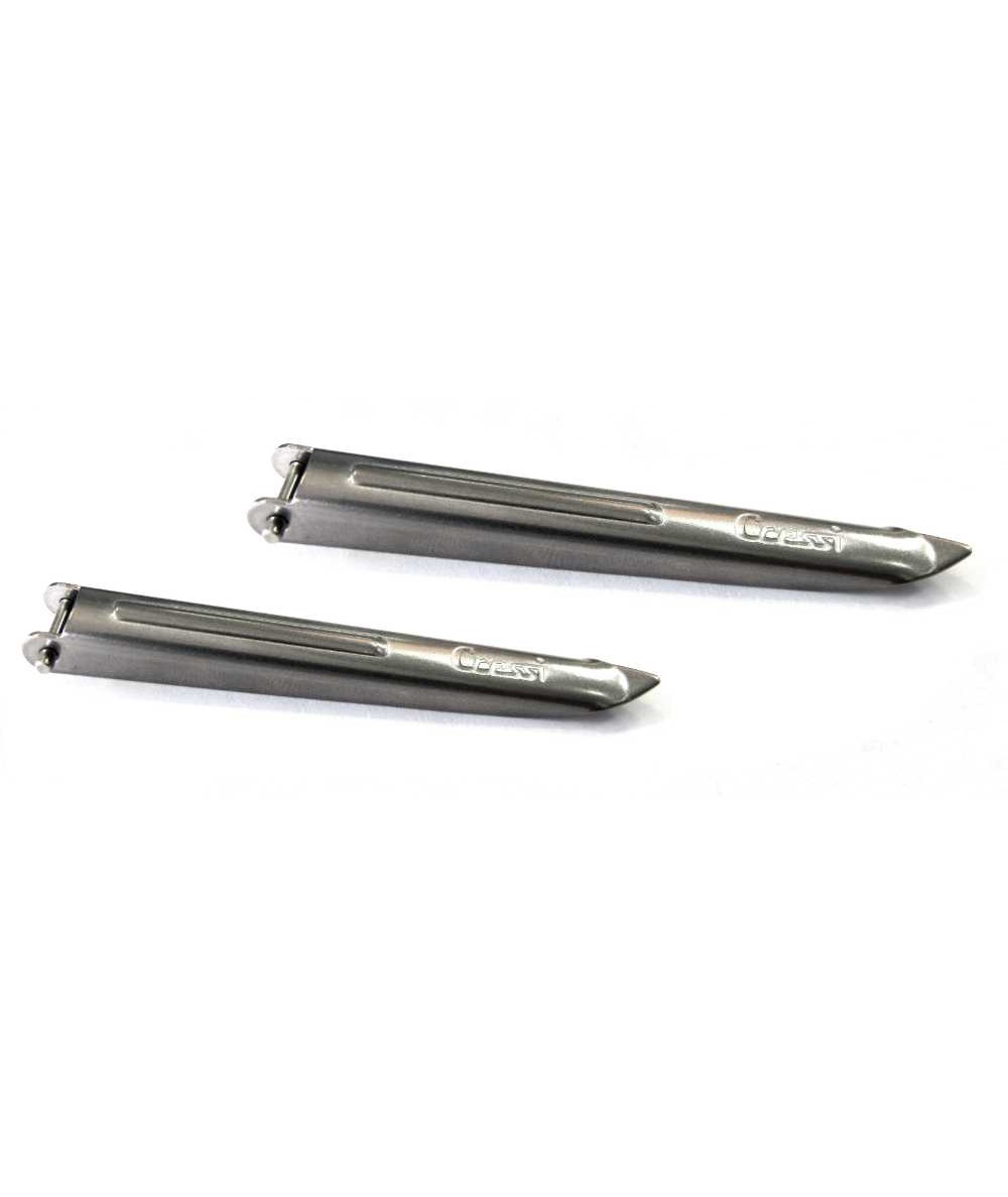 La varilla Cressi TEMPLA 6,7 mm está fabricada en acero AISI 630 templado, con aletilla en acero AISI 301 y diseño compatible con obuses metálicos y de Dyneema.