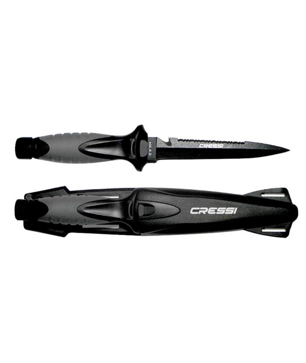El Cuchillo Cressi Grip es pequeño pero resistente, con un diseño ergonómico y seguro. Hoja de acero inoxidable 304 al carbono con doble filo, cortacabos y sistema de extracción rápida. Ideal para buceo y actividades acuáticas.