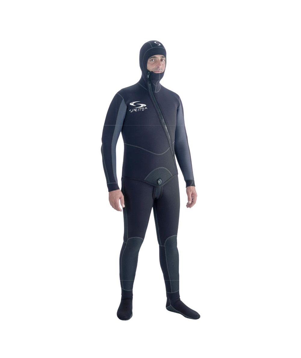 Este traje destaca por sus refuerzos externos de alta resistencia en codos, rodillas y zona de la espalda, proporcionando protección extra en actividades como la pesca submarina y el marisqueo. Su diseño ergonómico y paneles elásticos permiten una libertad de movimiento inigualable, facilitando la maniobrabilidad bajo el agua.